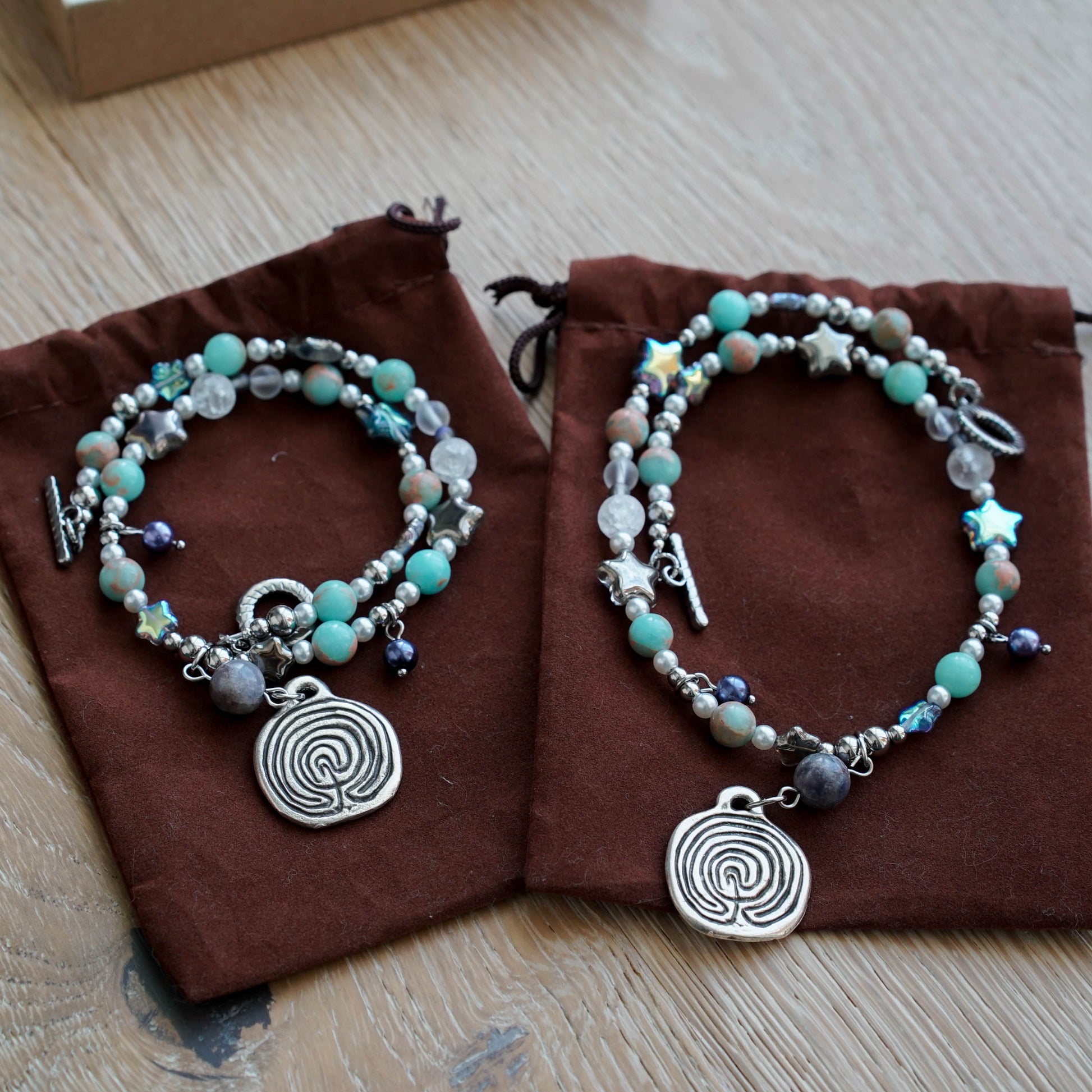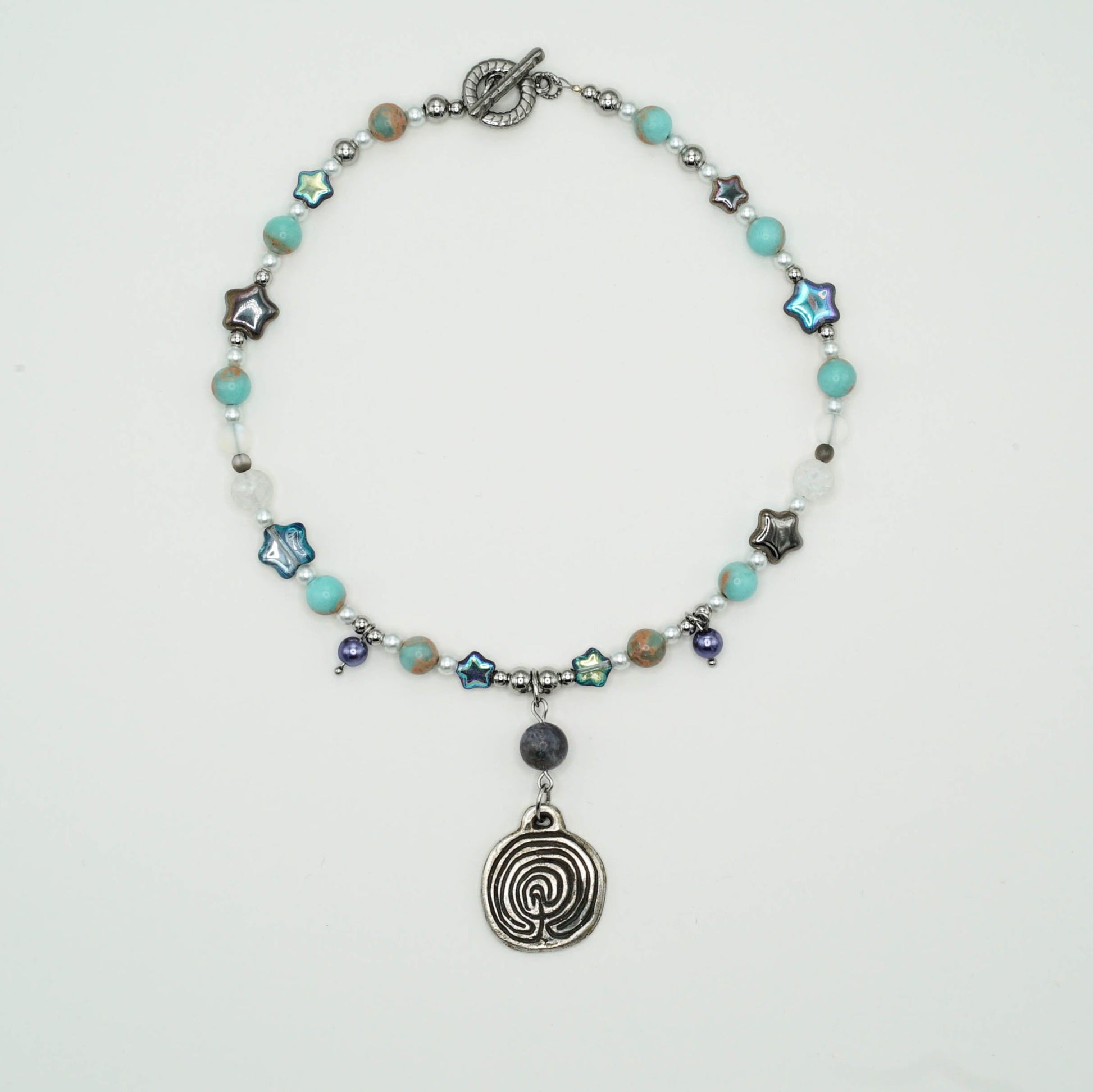 Enchant your enemies with this angelic choker strung with natural gemstones in soft shades of baby blue, coral, and cloud white. At the necklace's center hangs an iolite gemstone and a pewter pendant etched with a labyrinth pattern—a symbol of spiritual pilgrimage. Designed for those who wish to glow with an otherworldly charm.