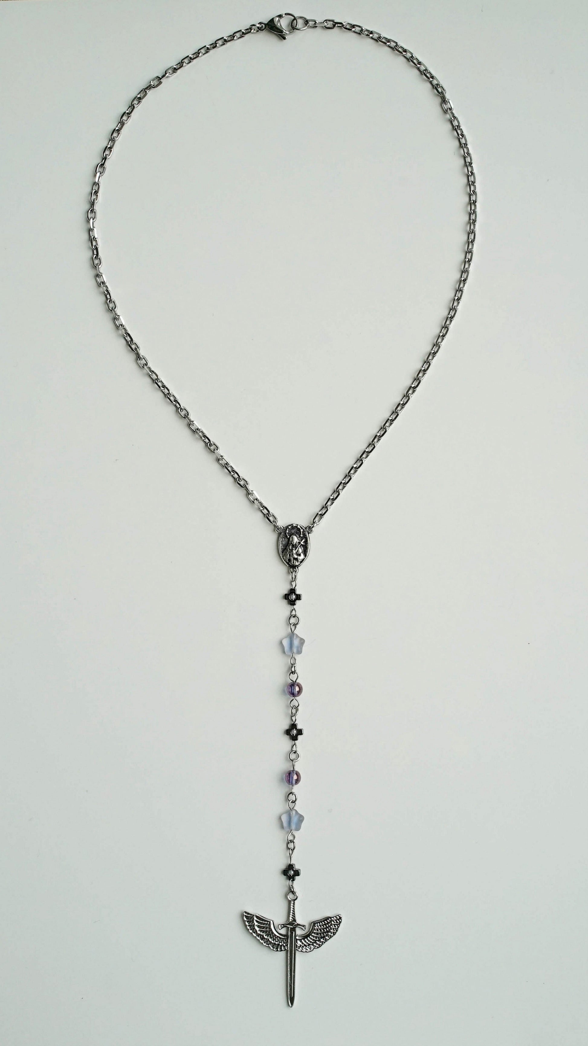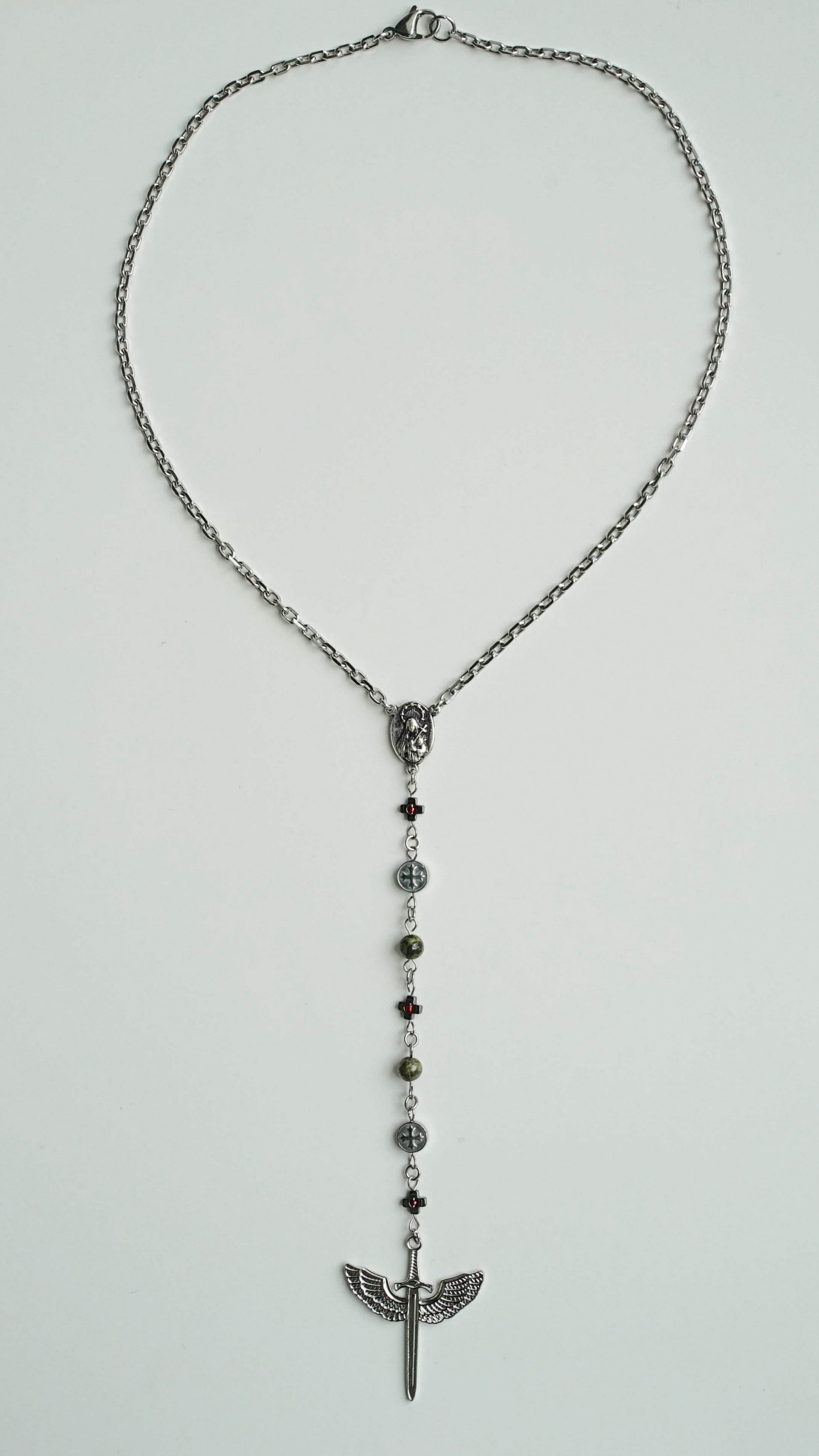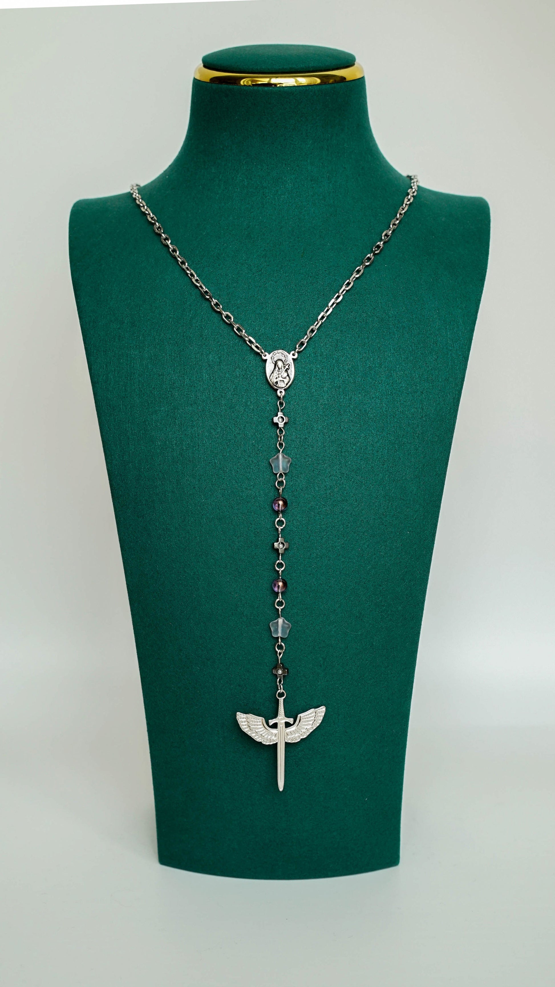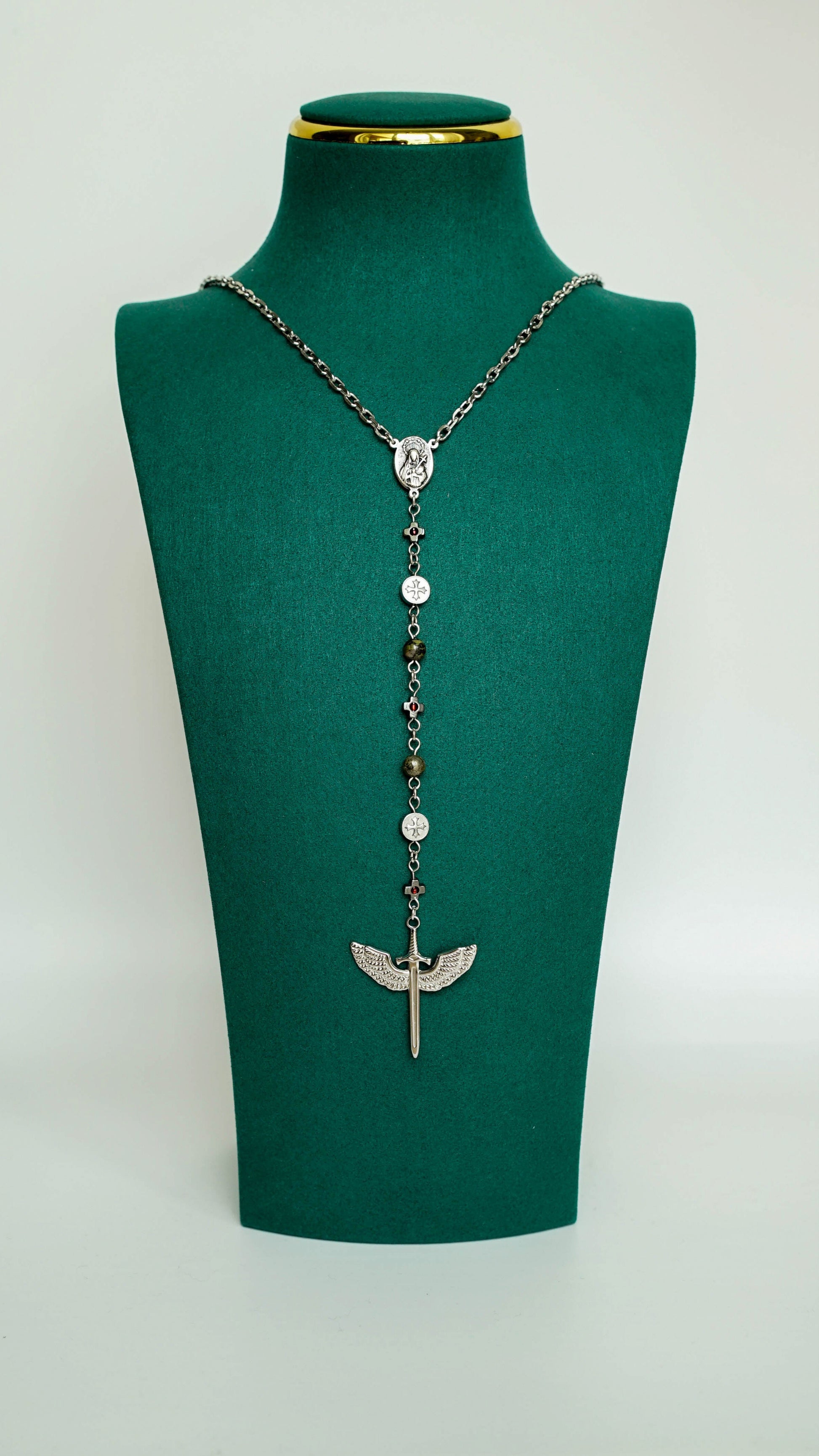 Featuring a lead-free pewter rosary centerpiece engraved with Terra Santa and a sword pendant flanked by angel wings, this piece is a statement of duality: rebellion and reverence.