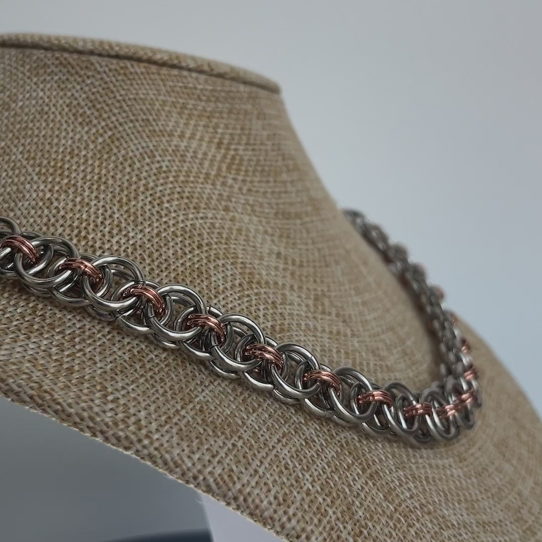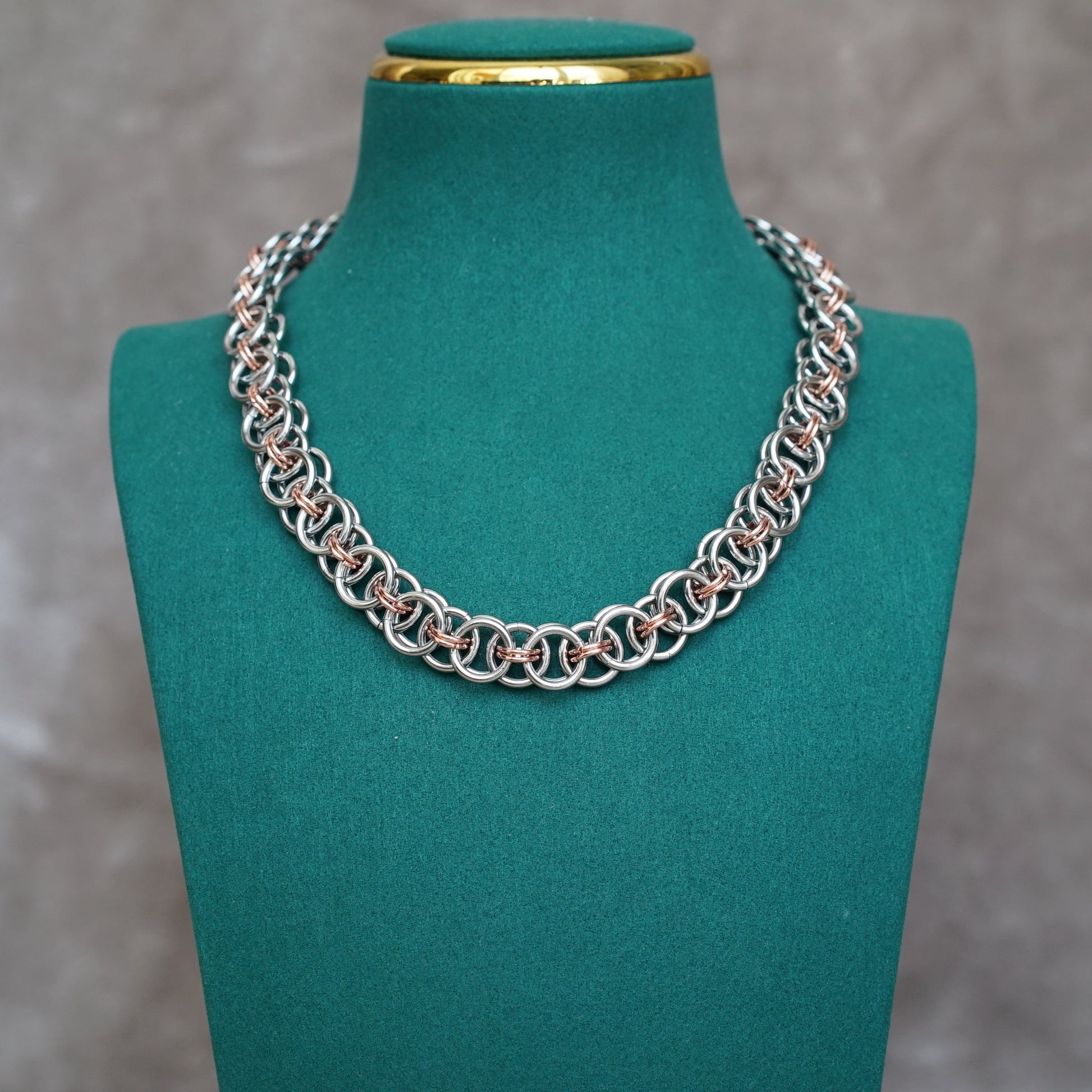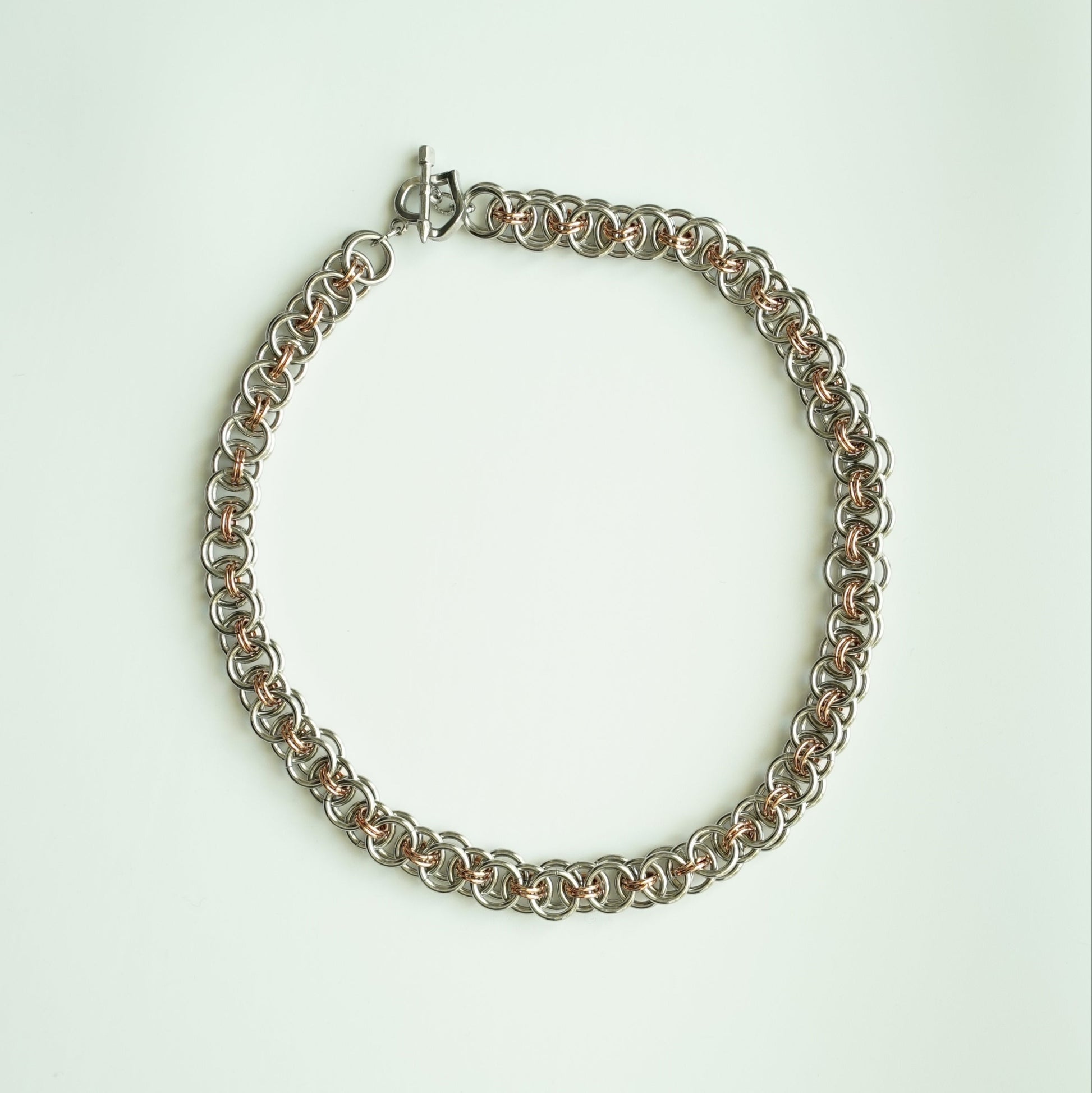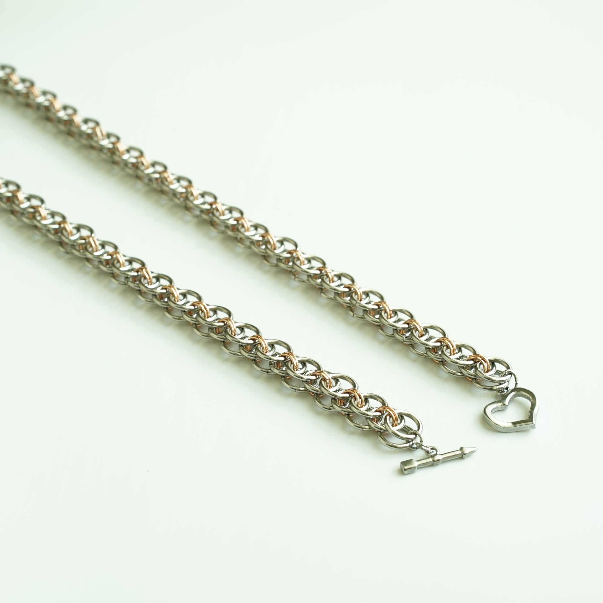Shatter your admirer’s minds by charging onto the battlefield with this armor-like chainmaille necklace. Durable stainless steel and rose gold plated rings are woven in a Helm Chain pattern so you can look classy while bashing enemies’ heads in. Finished with a heart and arrow shaped toggle clasp for a romantic finish among the (hopefully fictional) bloodshed ⚔️🩸.