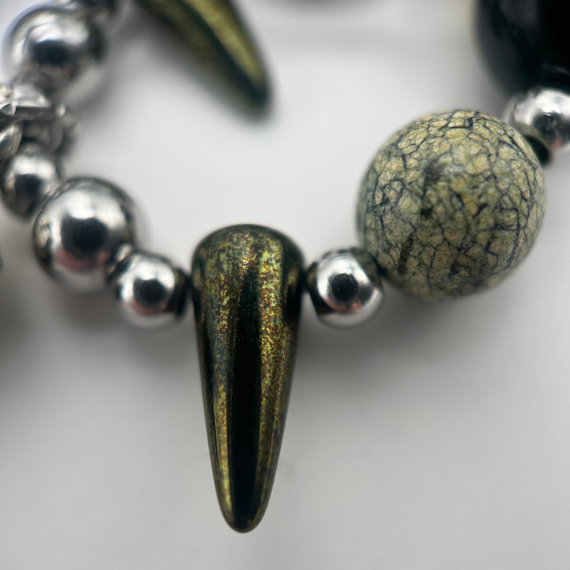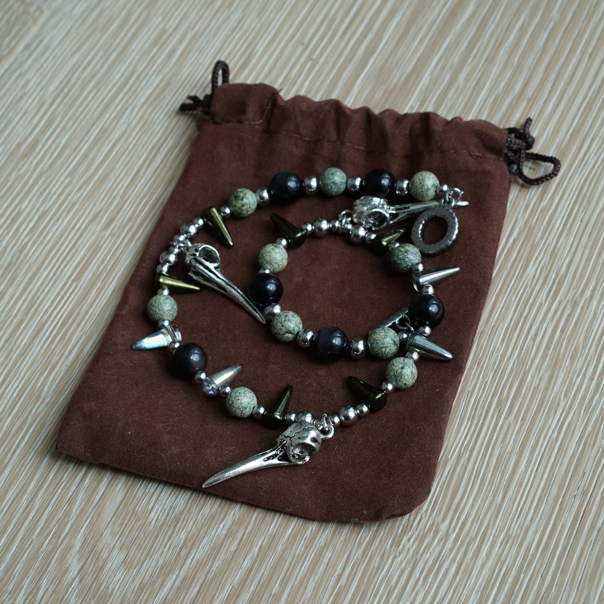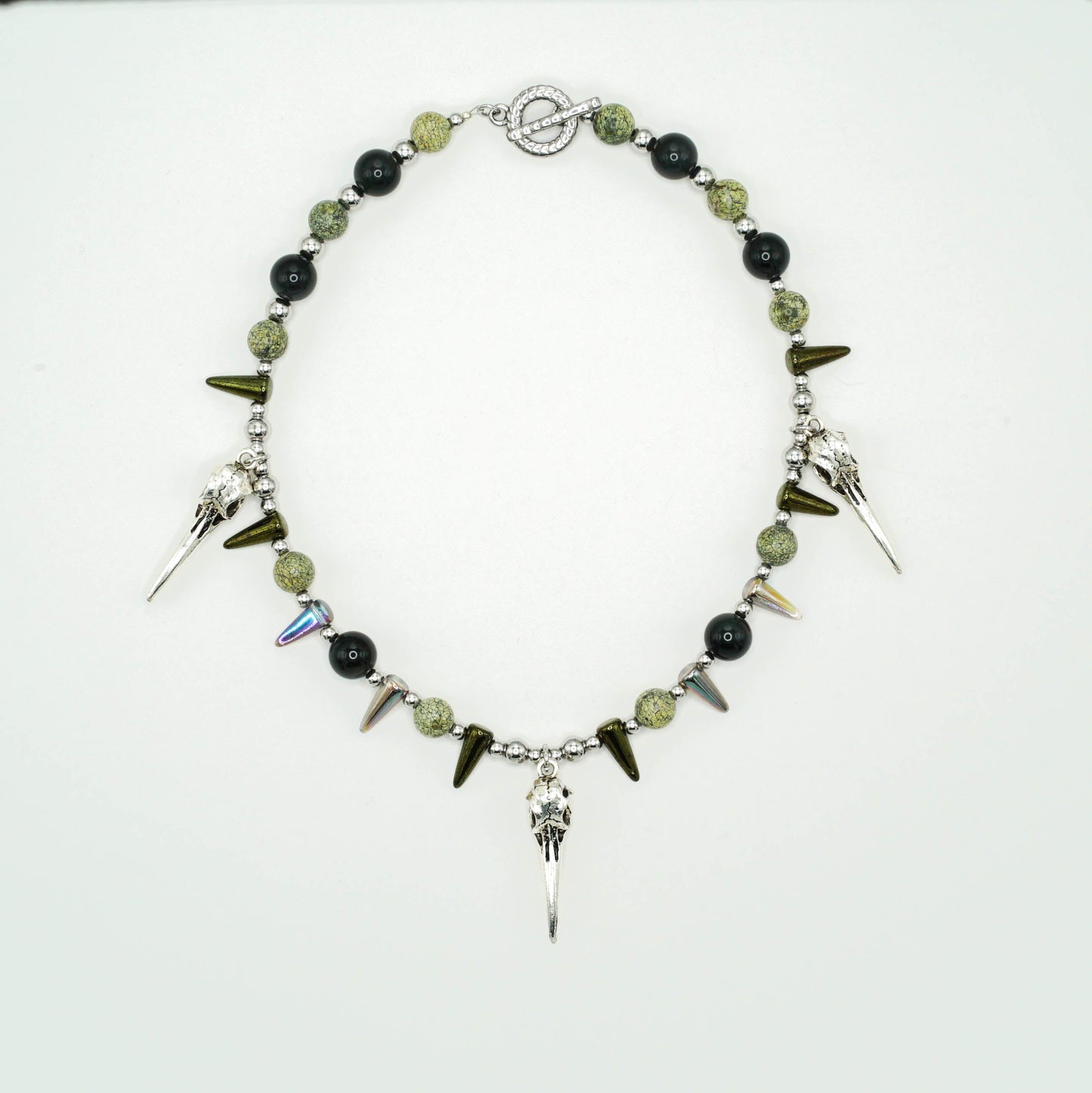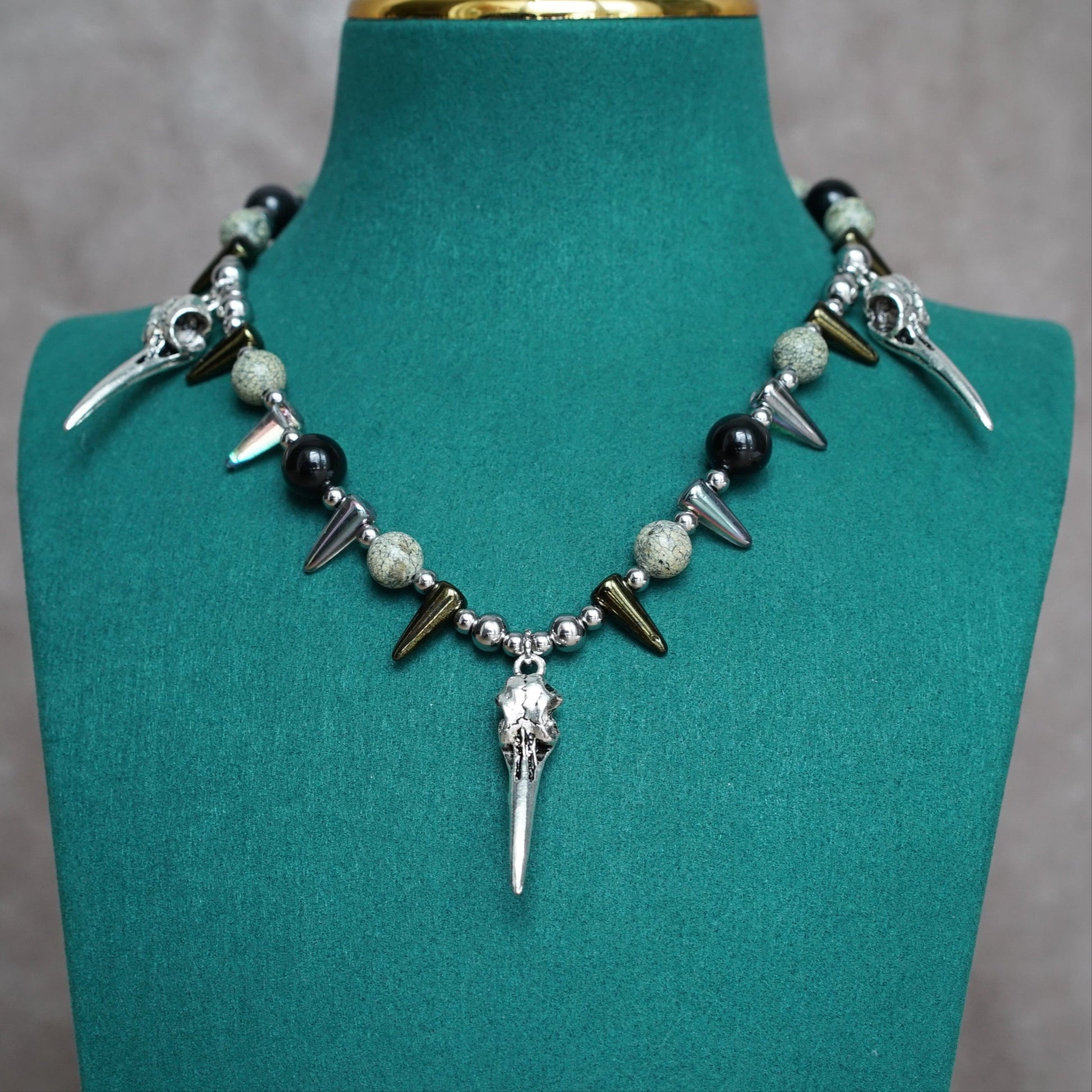 This striking necklace pays homage to an ancient Celtic deity. Three bird skull charms are a nod to The Morrígan’s raven form, symbols of death and prophecy. moss-like Russian serpentine and rainbow obsidian gemstones conjure misty bogs and ancient battlefields in the imagination. A must-have for myth lovers, rotcore romantics, and goth babes who are one with the swamp.