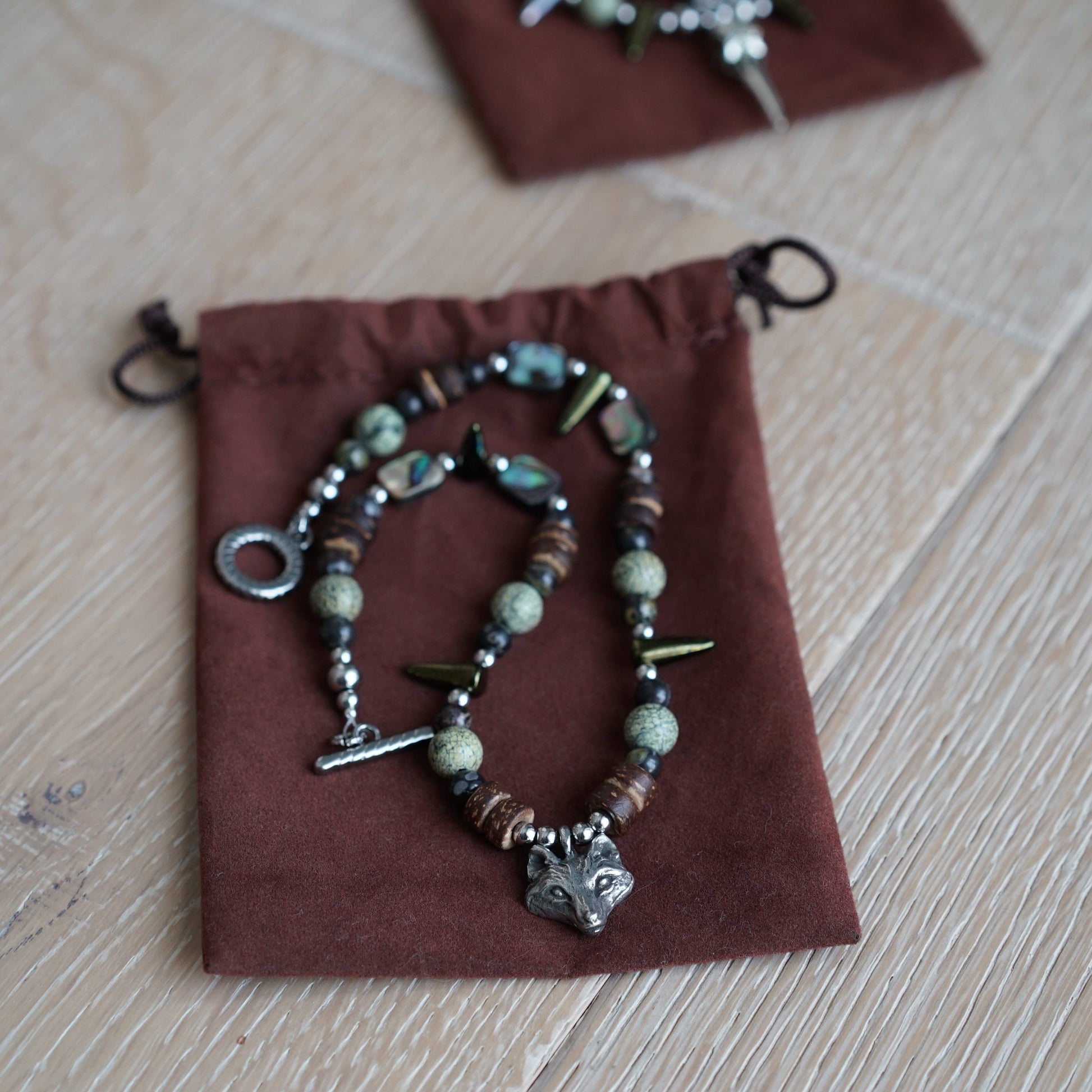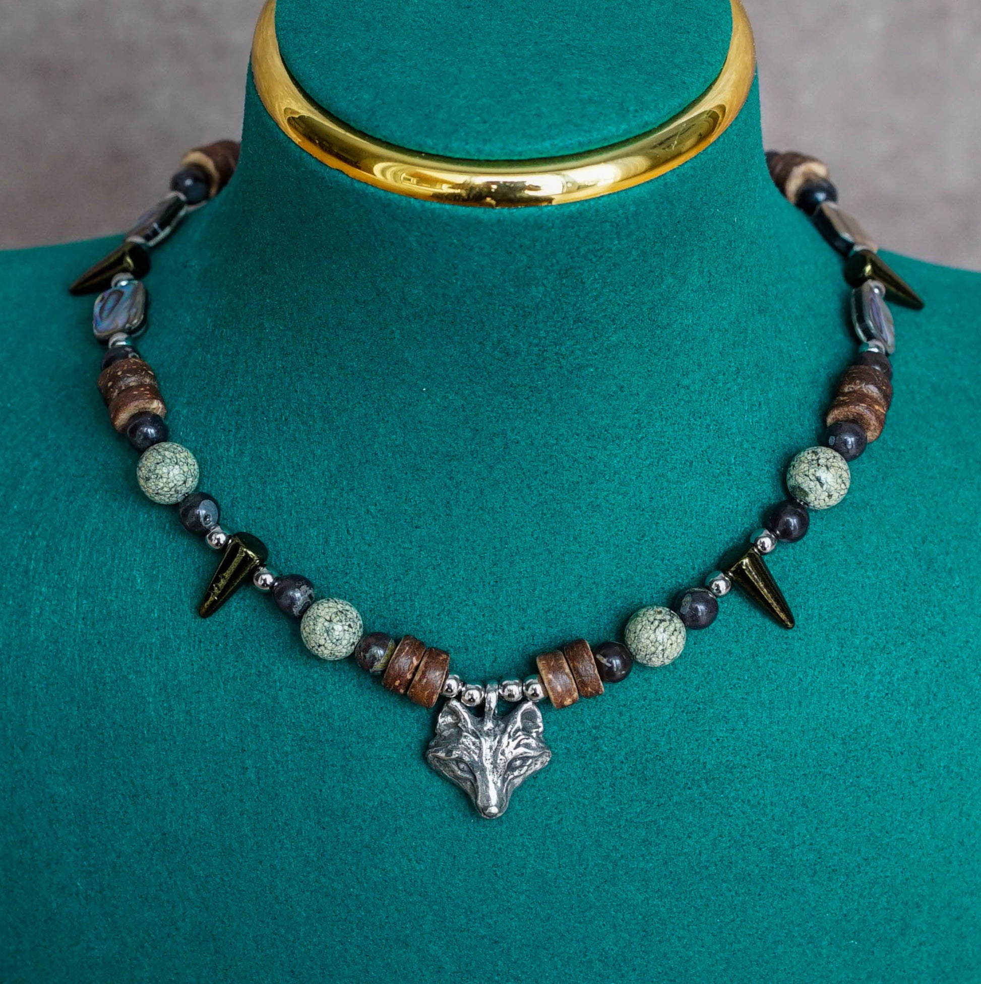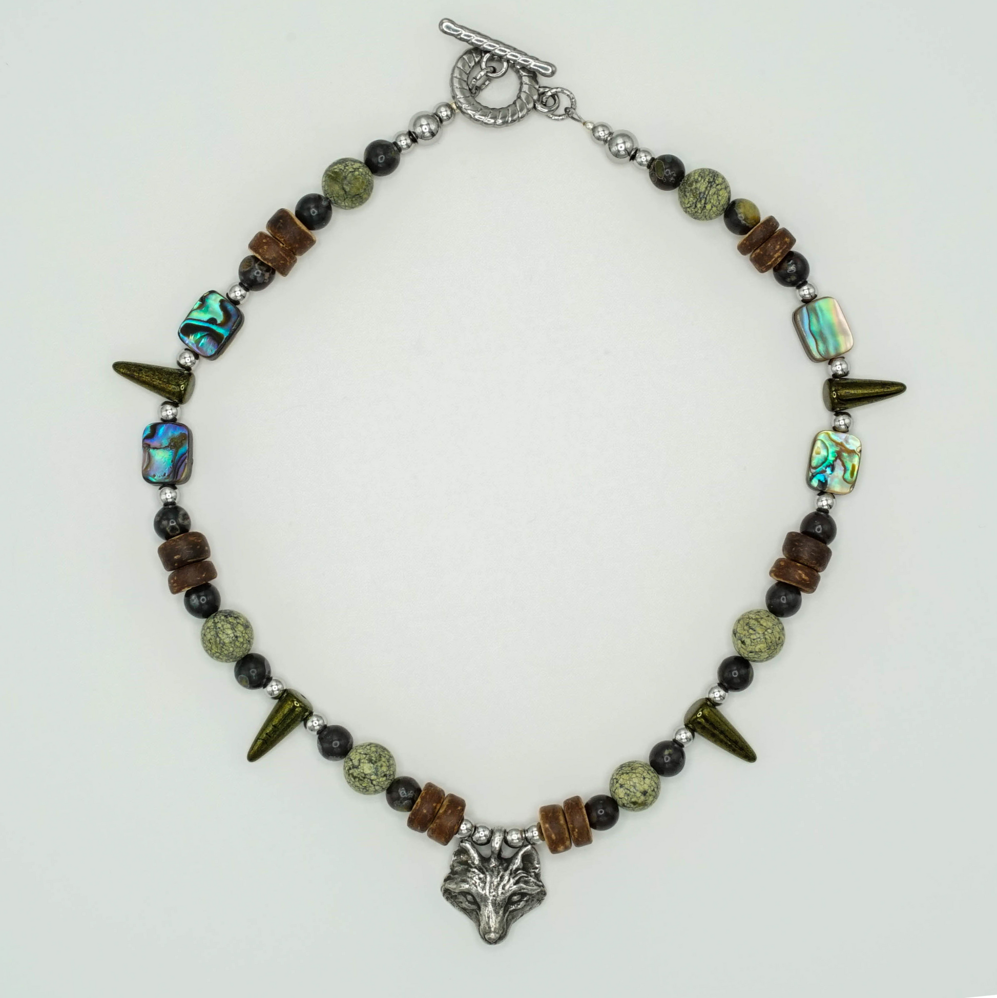 Evoke the allure of an enchanted forest with this fantasy-inspired choker. Strung with moss green and black gemstones, rugged browns, silver hues, and the rainbow sheen of abalone shell beads. Hanging at its heart is a pewter wolf pendant—an emblem of the wearer's untamed spirit and limitless potential. Handcrafted for those unafraid to frolic with dangerous woodland creatures and befriend them.