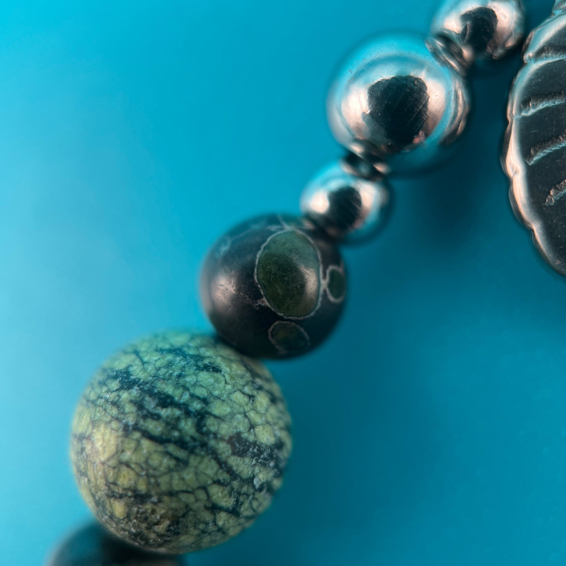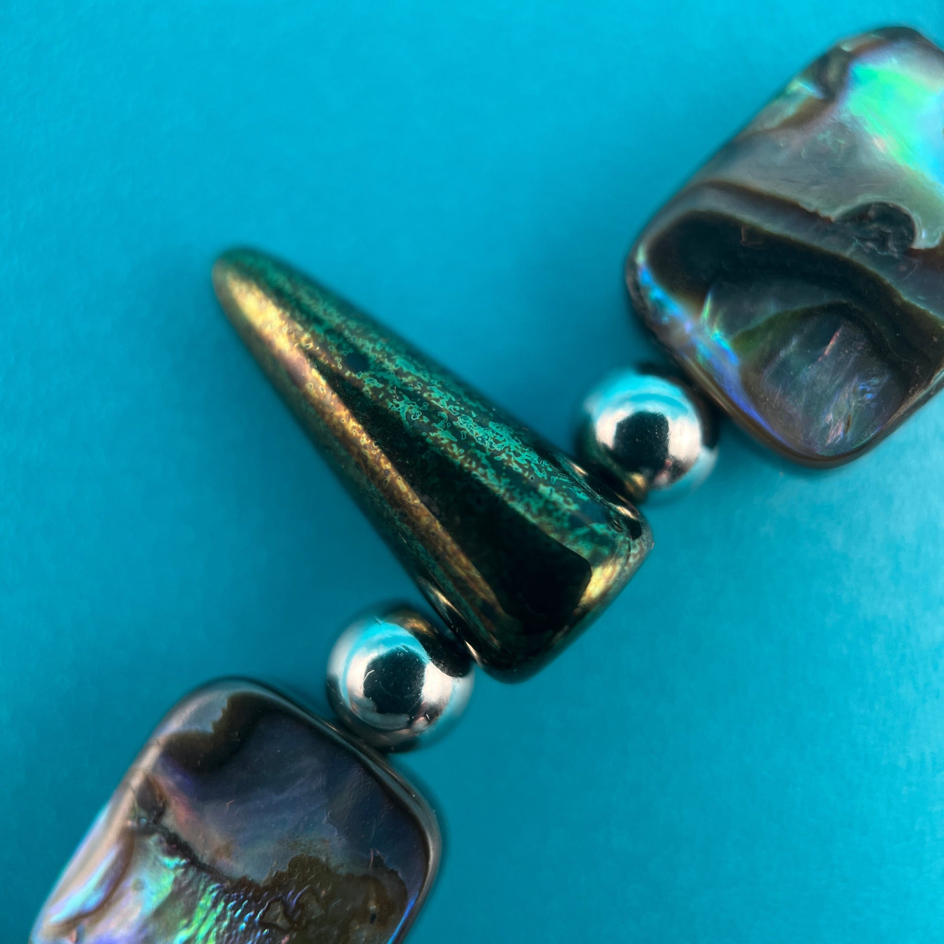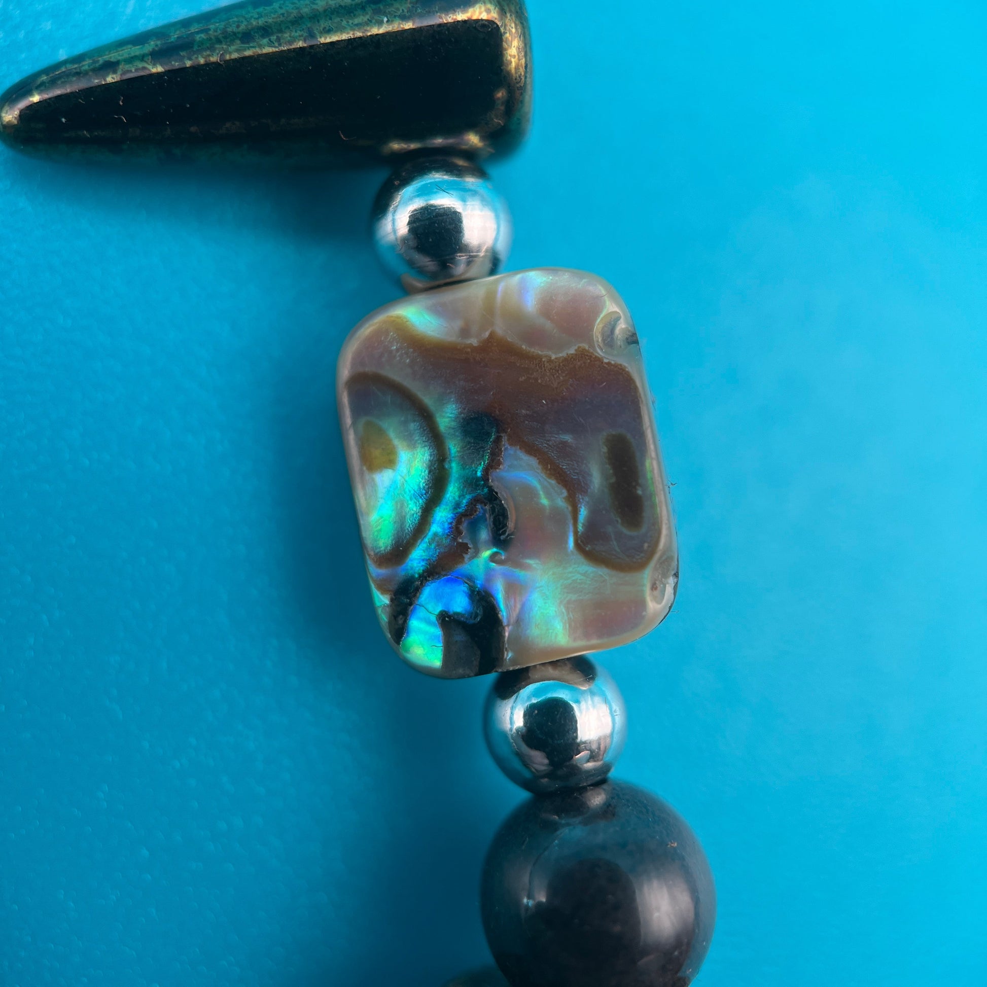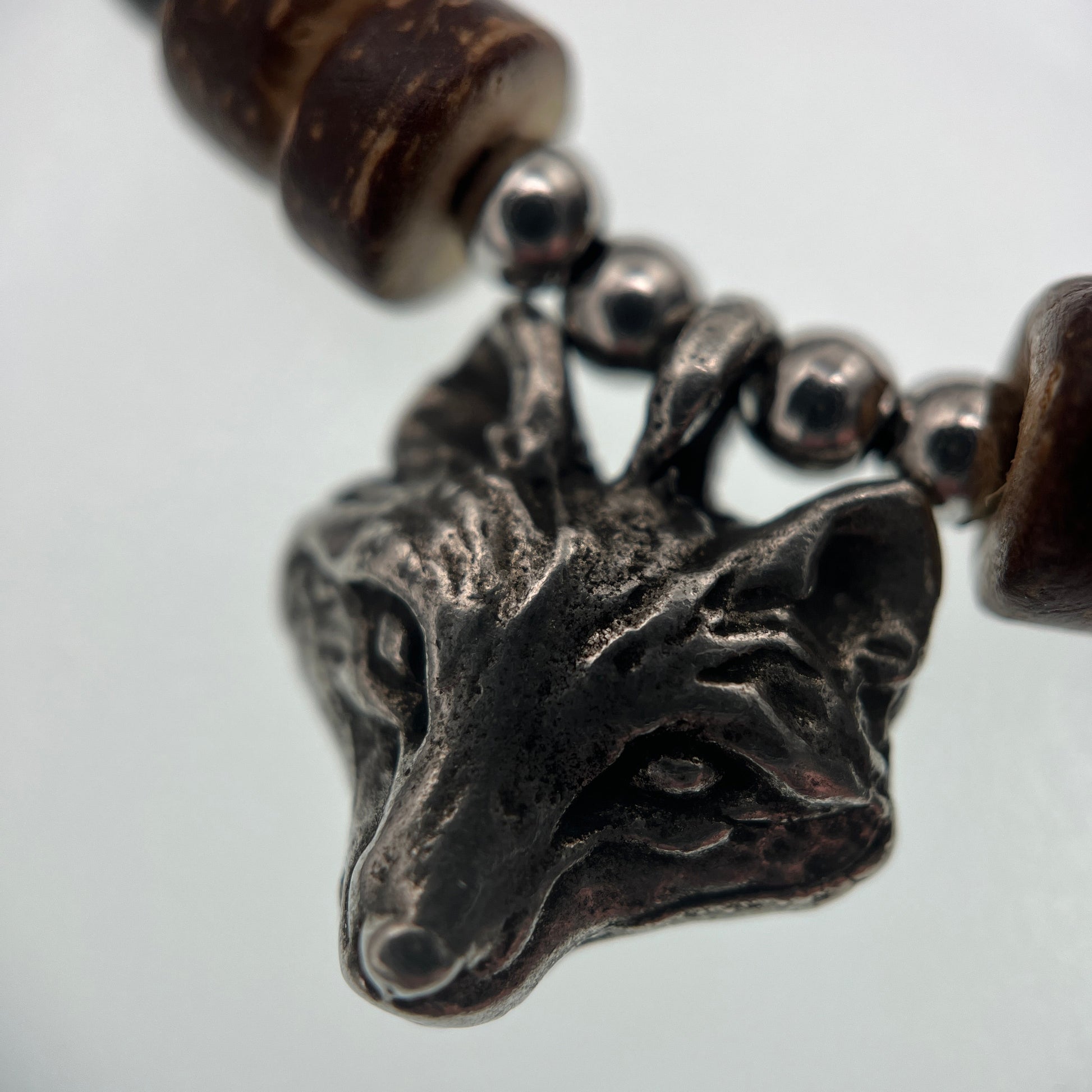Evoke the allure of an enchanted forest with this fantasy-inspired choker. Strung with moss green and black gemstones, rugged browns, silver hues, and the rainbow sheen of abalone shell beads. Hanging at its heart is a pewter wolf pendant—an emblem of the wearer's untamed spirit and limitless potential. Handcrafted for those unafraid to frolic with dangerous woodland creatures and befriend them.